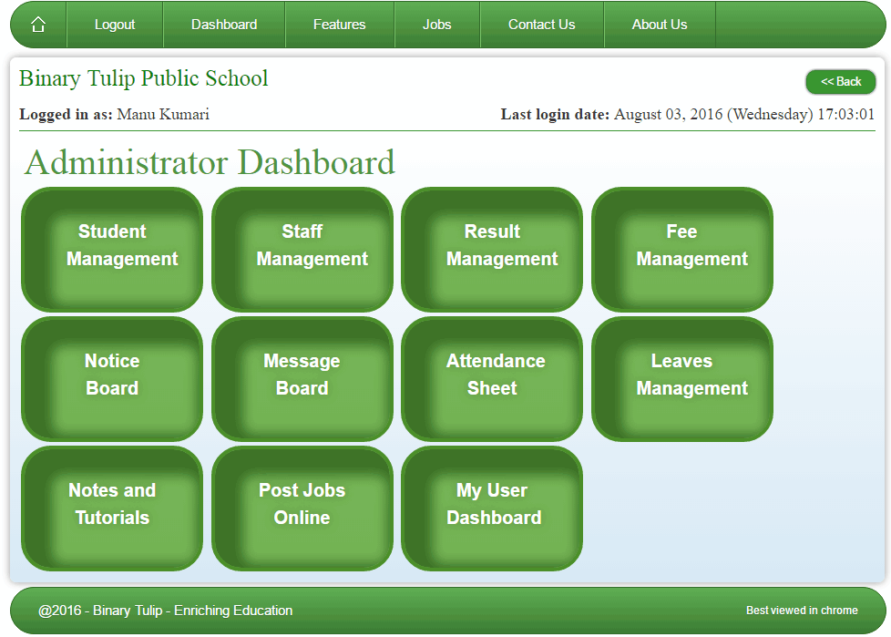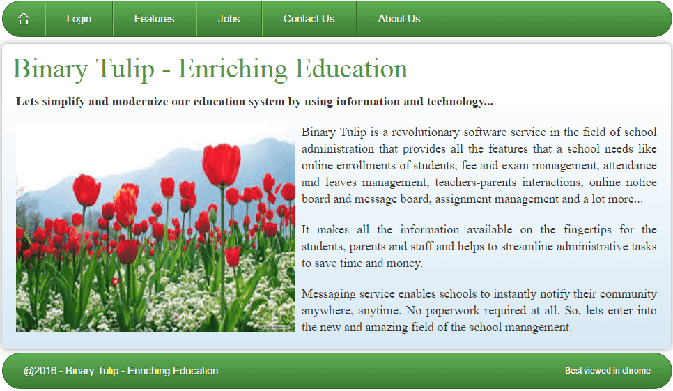 Binary Tulip is a school administration software that streamlines essential operations through features like attendance management and fee processing, allowing educators and administrators to enhance communication and efficiency. By centralizing student information and automating routine tasks, it significantly reduces administrative burdens. Designed for schools, it promotes a more organized and effective educational environment, ultimately leading to improved student and parent engagement.